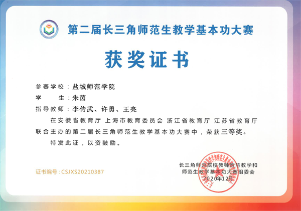 2020年10月24日至25日,江苏省第九届师范生教学基本功大赛中学理科组在南通大学举行,比赛内容包括基础知识与应用、通用技能和专业技能三部分。我院地理科学17级余涵获得中学地理学科二等奖的好成绩。同时,余涵和朱茵获得第二届长三角师范生教学基本功大赛三等奖。