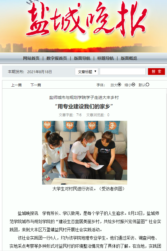 8月18日,《盐城晚报》A05版以图文新闻的形式报道了城市与规划学院“建设生态宜居美丽乡村,共绘乡村振兴宏伟蓝图”暑期实践活动。