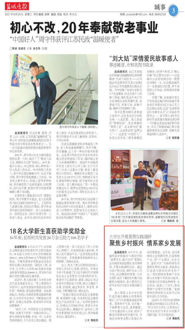 8月25日,《盐城晚报》03版以新闻的形式报道了城市与规划学院“聚焦乡村振兴 情系家乡发展”暑期社会实践活动。