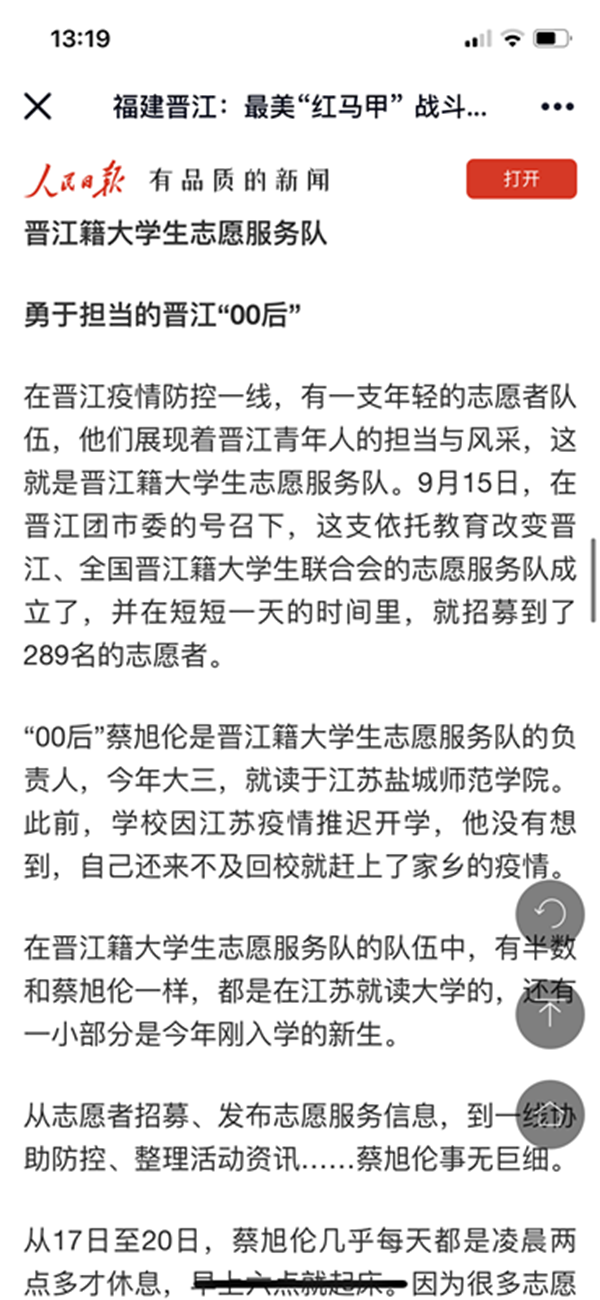 9月22日,【人民日报】新闻客户端专题报道我院福建晋江籍学生海洋196班蔡旭伦疫情防控志愿服务。