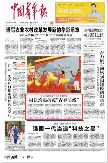 9月24日,【中国青年报】新闻专题报道我院福建晋江籍学生海洋196班蔡旭伦疫情防控志愿服务。