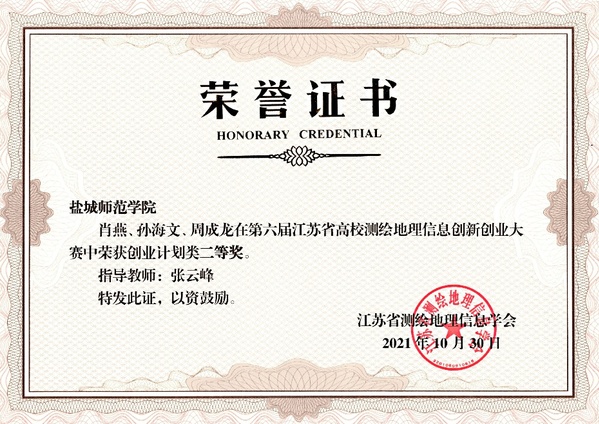 为积极响应“大众创业、万众创新”的号召,培养高校大学生创新创业意识和能力,为社会输送创新型、复合型测绘地理信息人才。10月29日至30日,由江苏省测绘地理信息学会主办的第六届江苏省高校测绘地理信息创新创业大赛在南京工业大学举行。我院参赛团队在张云峰老师的精心指导下,高质量完成作品创作与报送工作。推送的作品《基于无人机的海洋环境智能监测服务项目》(学生团队:肖燕、周成龙、孙海文、徐畅、李丹),经过选手激烈角逐,脱颖而出,荣获二等奖。(文图:肖燕;审核:张华兵)