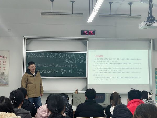 华东师范大学博士蒋超为海洋资源开发技术专业学生作“黄河口动力地貌过程及影响机制”专题报告。他结合在华师大的学习研究经历,让同学们了解河口重要的经济价值和黄河入海口地貌演变,鼓励同学们多交流多沟通,寻找研究偏差,进行更深层次研究。