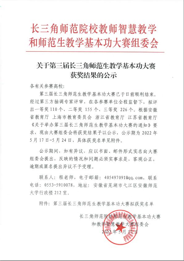 我院高度重视本次长三角师范生大赛,成立专项指导小组,加强顶层规划,指导教师精心辅导。比赛准备过程中,学院院长李传武专门为选手传授比赛经验,鼓舞士气,经过多个环节的激烈角逐,最终荣获佳绩。下一阶段,学院将继续以地理科学省级一流本科专业建设点为契机,进一步加强师范生教学基本功训练,不断提高人才培养质量。(文图:刘玉卿;审核:张华兵)
