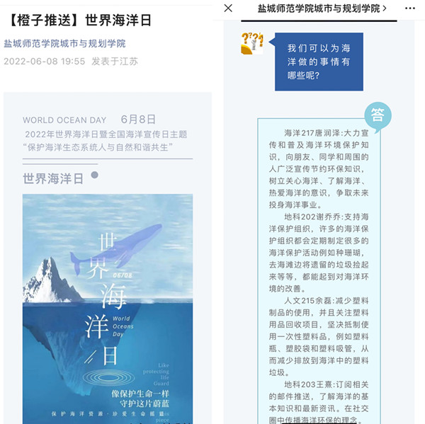 学院微信公众号推出“世界海洋日”专题推送,积极宣传普及海洋知识,呼吁大家守护蔚蓝海洋,以可持续的方式与海洋共生共存。同学们纷纷留下“关爱海洋,保护海洋,我们在行动”的青春倡议。