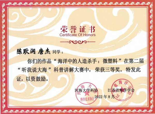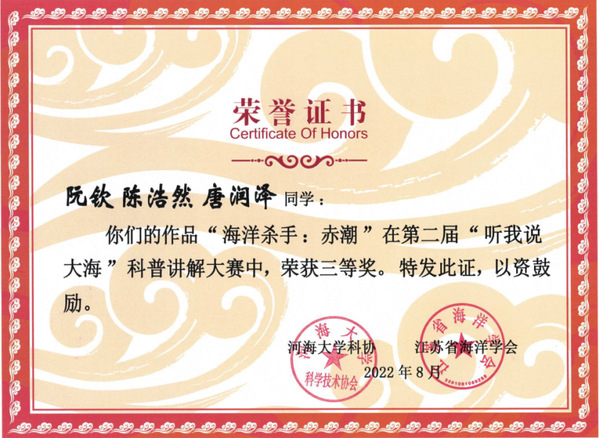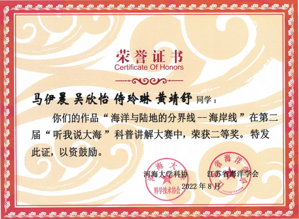 7月2日,由江苏省海洋学会主办的江苏省第二届“听我说大海”科普知识讲解大赛落下帷幕,城市与规划学院在本次大赛中喜获佳绩,有1件作品荣获二等奖,3件作品荣获三等奖。