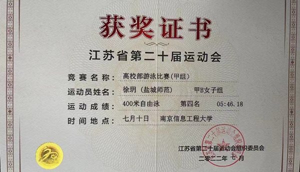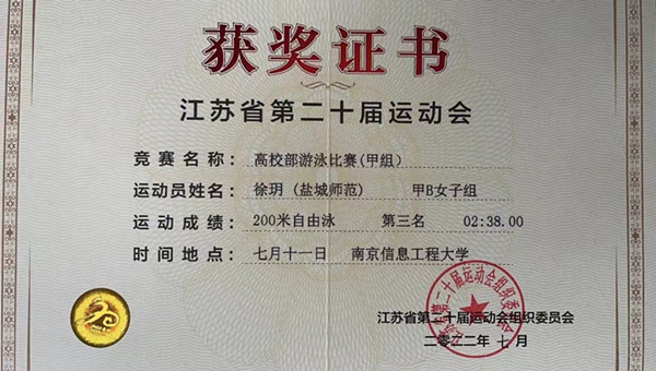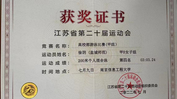 根据省运会通知,城市与规划学院高度重视,经学校报名、选拔,地科191班徐玥脱颖而出,最终代表盐城师范学院出征省运会,徐玥同学取得了甲B女子组200米自由泳泳铜牌、200米混合泳第四名,400米自由泳第四名的好成绩,突破我校在以上几个项目上最好成绩,取得了游泳项目比赛中奖牌。