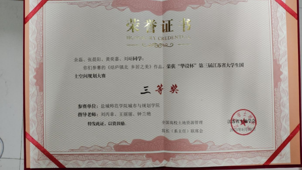 在前期初赛遴选的基础上,我院与南京大学、南京师范大学、河海大学、南京农业大学、南京工业大学、南京信息工程大学等高校的18支团队进入当天的决赛。在决赛中,我院学生代表不畏强敌,经过现场汇报、评审等环节的激烈角逐,我院推送的作品《结庐镇北 乡居之美》(参赛成员:余磊、张晨阳、黄奕嘉、刘峪;指导教师:刘丙章、王丽丽、钟兰艳)获得三等奖。