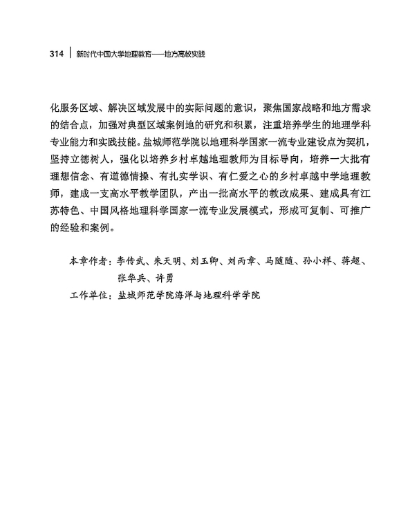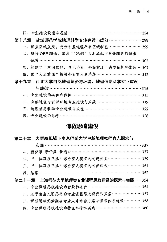 专业建设的第十八章,编入了盐城师范学院海洋与地理科学学院的地理科学国家一流专业建设与成效的实践成果(执笔人李传武、朱天明、刘玉卿、刘丙章、马随随、孙小祥、蒋超、张华兵、许勇),全面展示了学院地理科学国家一流专业(建设点)的专业建设水平和人才培养质量,建设经验将为全国地方高校地理教育改革提供有益借鉴。2021年学院地理科学专业成为国家一流本科专业建设点以来,聚焦地理科学区域特色,在乡村卓越地理教师培养体系、人才培养支撑体系、实践教学体系、大思政全面育人体系等方面不断探索,形成了独具区域特色专业建设模式。